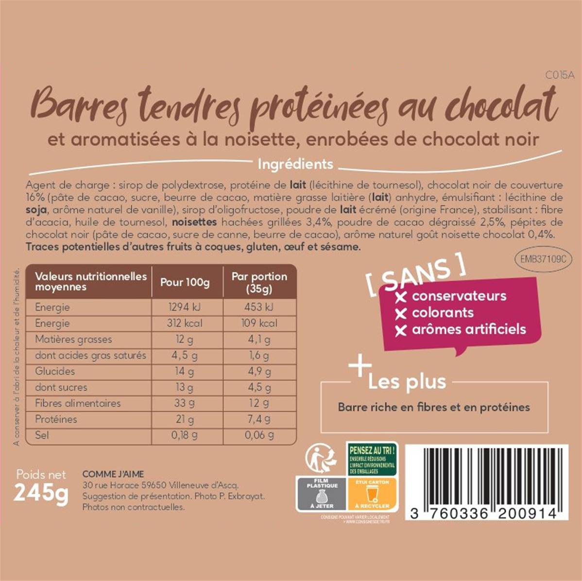hachées grillées 3,4%, poudre de cacao dégraissé 2,5%, pépites de chocolat noir (pâte de cacao, sucre de canne, beurre de cacao), arôme naturel goût