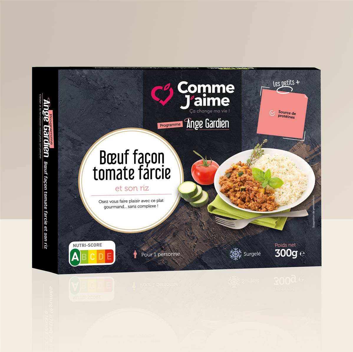 Riz cuit 32,8% (eau, riz), viande bovine hachée crue 26,1% (origine : France), eau, oignon, purée de tomate double concentrée 5,2%, tomate 4,5%, courgette 3,9%, huile de colza, semoule de