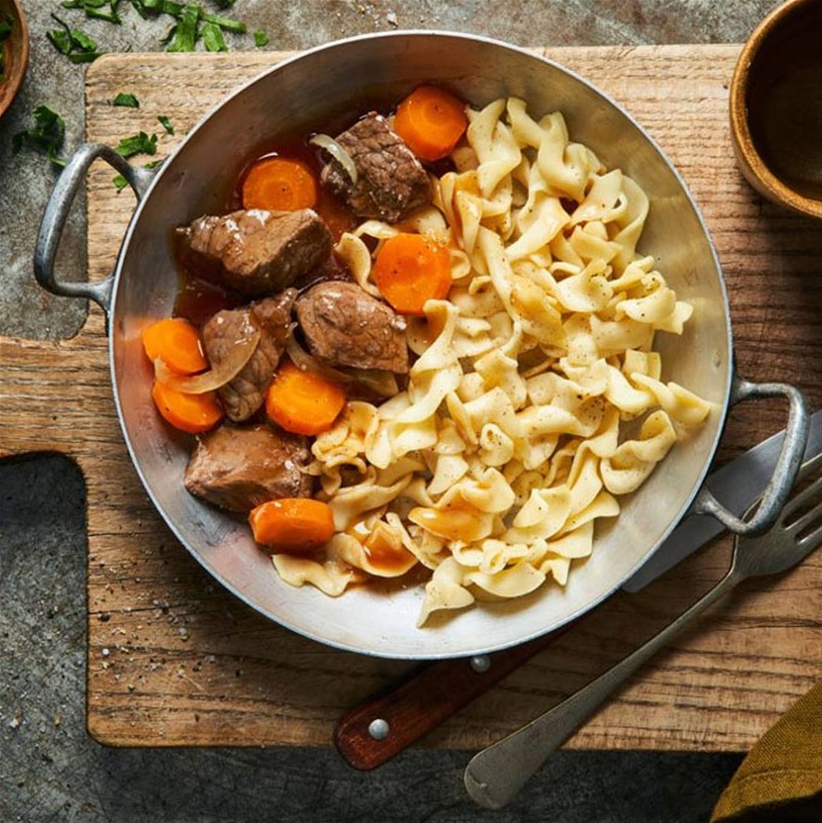 Un plat traditionnel et réconfortant avec ses morceaux de viande bien tendre, mijotés avec des carottes et des oignons parfumés aux herbes aromatiques et juste ce qu'il faut de vin rouge. Pour que le plaisir soit complet, de bonnes pâtes accompagnent ce plat !