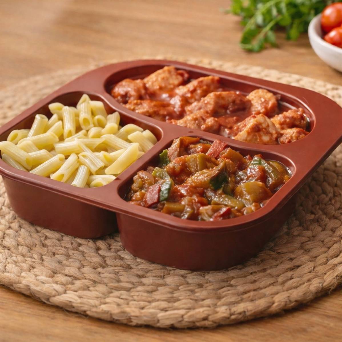 Notre trio Minceur composé de morceaux de poulet tendres et savoureux au pesto de tomates, de mini penne et d’une ratatouille colorée mêlant aubergines, courgettes, poivrons et tomates. Des protéines, des féculents et des légumes, que vous pouvez manger séparément pour préserver textures et saveurs, ou bien mélangés.