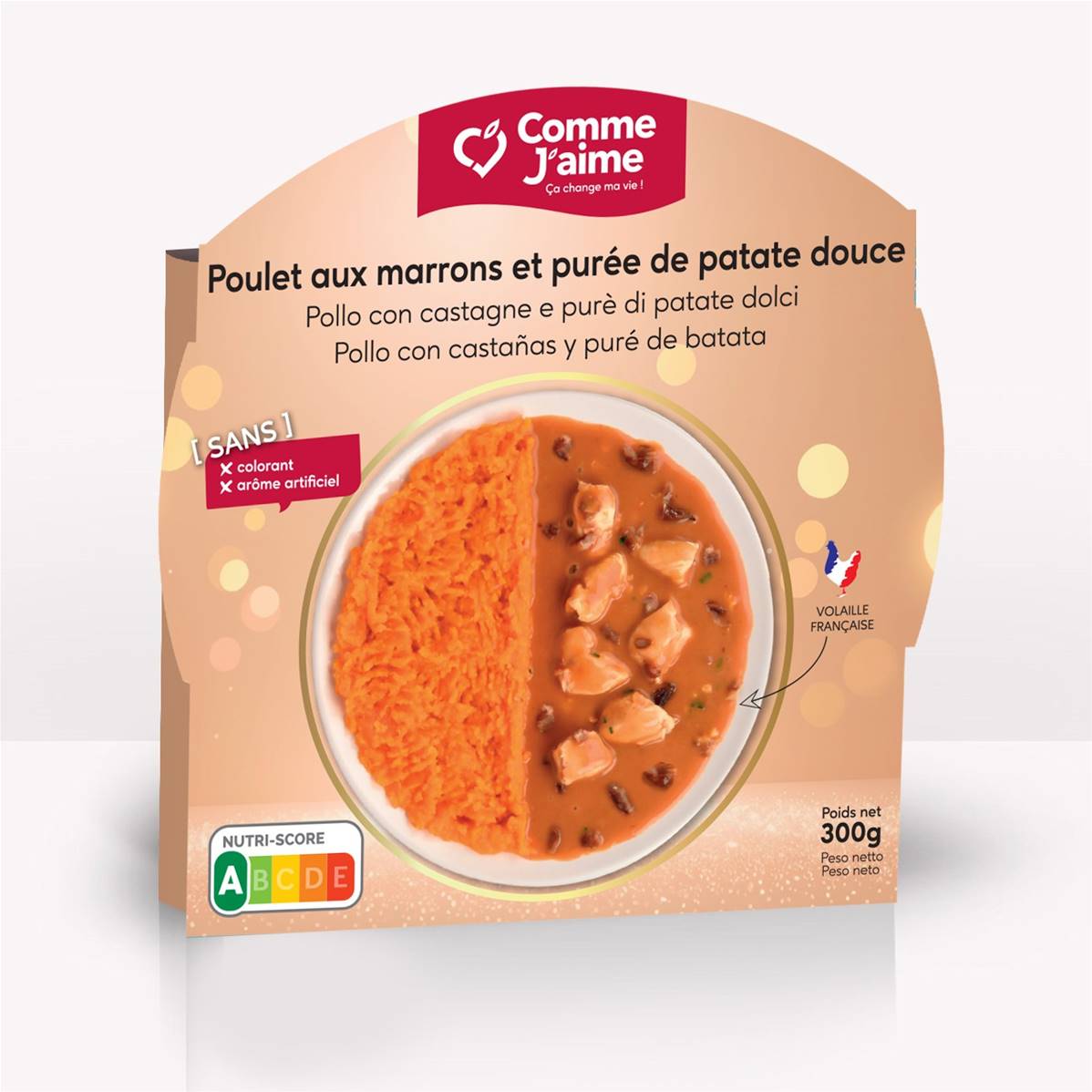 Ingrédients : Purée de patate douce 45 % (patates douces précuites 32 %, eau, pommes de terre déshydratées, huile de colza, crème, amidon, miel, sel), viande de poulet traitée en salaison et précuite 23 % (viande de poulet [origine : France], eau, amidon, sel), eau, brisures de marrons 6 %, brisures de girolles 3 %, crème, oignons, amidons, huile de colza, fibres de citron, ciboulette, protéines de lait, arômes naturels, sel, poivre, arôme naturel de laurier, arôme naturel de champignon, arôme naturel de girofle.