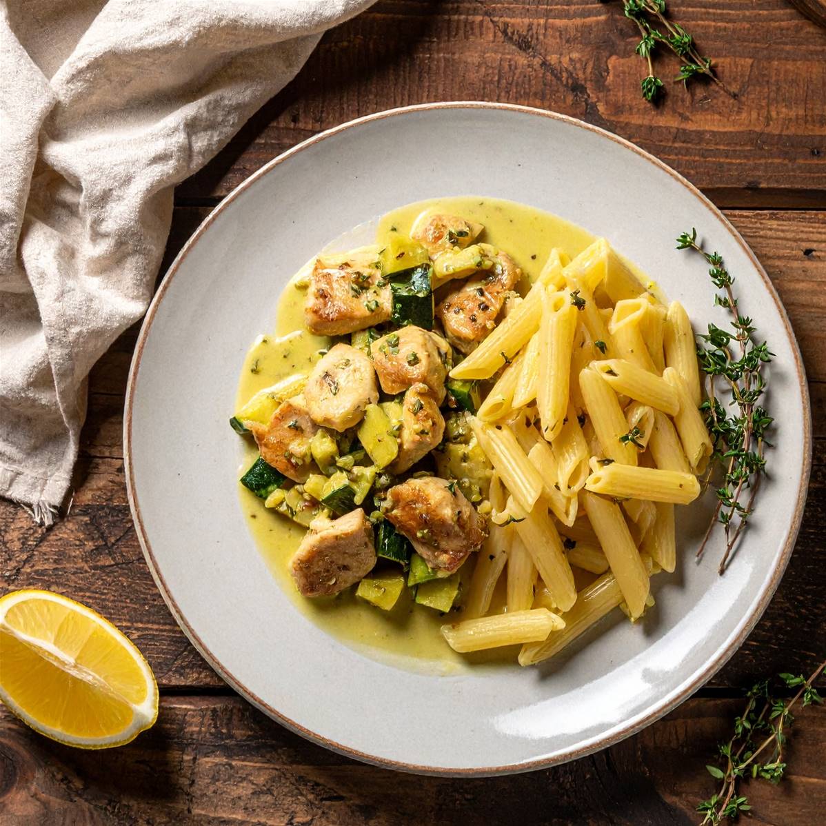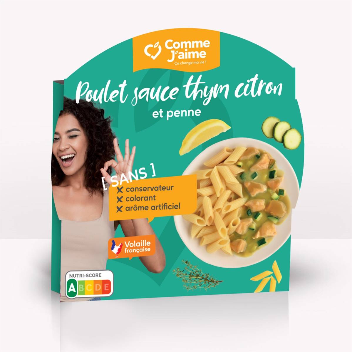 Ingrédients : Pâtes cuites huilées 33% (semoule de blé dur, poudre de blanc d'œufs, eau, huile), sauté de poulet 20% (origine France), eau, courgettes 16%, fromage blanc, (lait), amidon de riz, farine de blé, jus de citron 0,.5%, sel, ail, thym 0,09%, romarin, arôme naturel, épices.