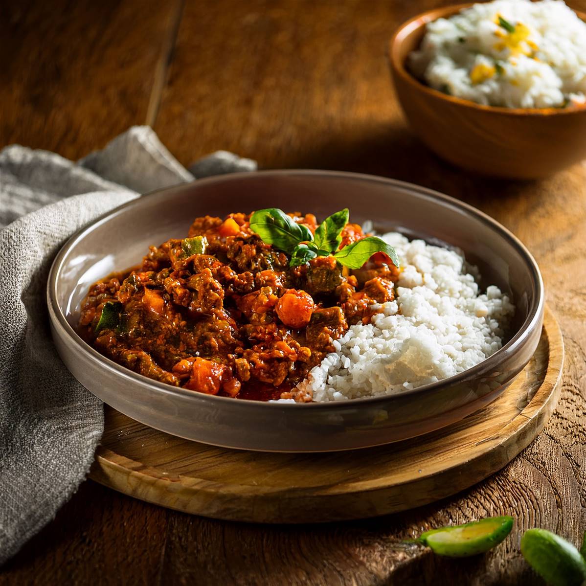 Du bœuf haché cuisiné avec des herbes, de l’ail, des tomates et courgettes façon tomate farcie et accompagné de riz pour une recette savoureuse et équilibrée.