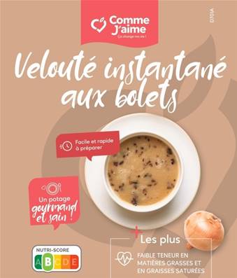 Ingrédients : Fécule de pomme de terre, légumes déshydratés 19% (pomme de terre, bolet (7%), oignon), lactosérum (lait), lait écrémé en poudre, arômes naturels, sucre, sel, amidon de tapioca, ail poudre, extrait de cèpes.